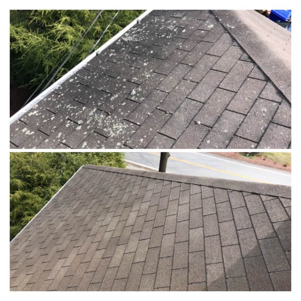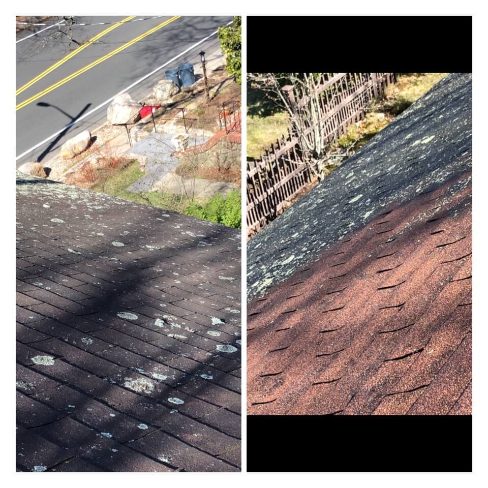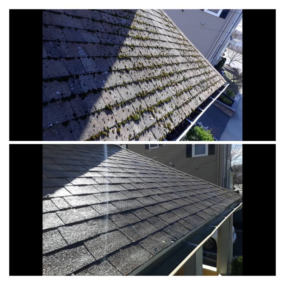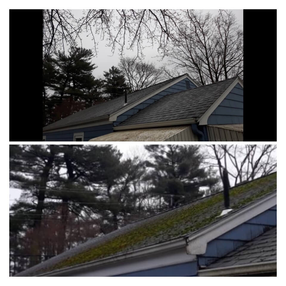 HiCleaners is the most experienced company in Marlborough, MA that deals with roof washing and roof soft washing. All of our employees are trained to recognize precise solution mixing ratios to provide you with the safest and most effective soft washing service. Roofs are a commonly neglected part of a house due to the fact that most people don’t have ladders to access it, so it is very easy to just leave it alone and forget about problems that may start to arise. Just like many home owners, discoloration and small bits of moss on a roof can be overlooked because of the misconception that it is just aesthetic. However, it isn’t just aesthetic, the moss slowly lifts the granules off the shingles which in turn shorten the life of the shingle. The moss also spreads, just like any bacteria if it is left alone for too long, it can quickly become a problem that spirals out of control. Call HiCleaners for a free quote, we only use the most advanced eco-friendly solutions and equipment to make sure the job is done right, for the safety of the employees, your plants, grass, pets, and children.